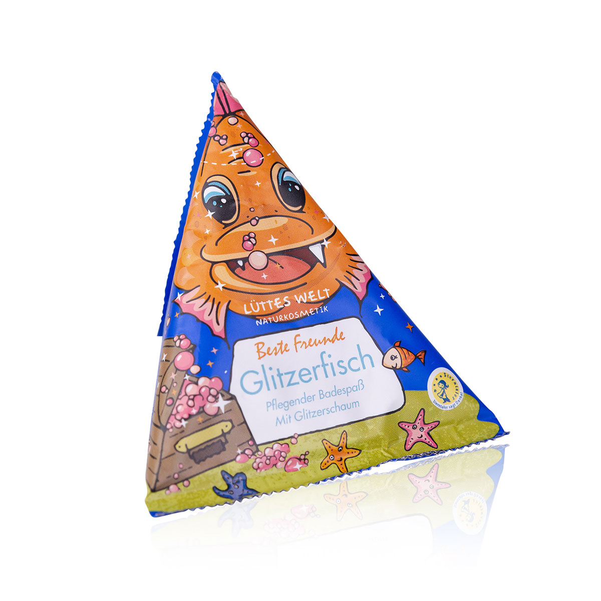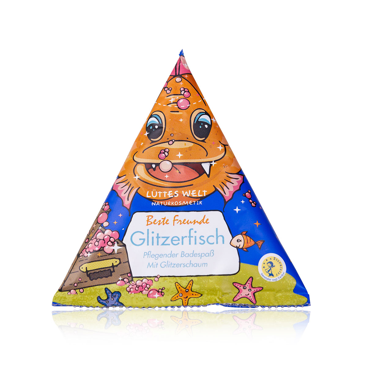 - Lüttes Welt Bade Vulkan, Motiv: Beste Freunde Glitzerfisch, für zauberhaften Glitzerschaum sorgt ein mineralisches Pulver, das sich im Schaum spiegelt. Mit Meersalz, Kieselsäure, Jojobaöl und Färberdistelöl, vegan