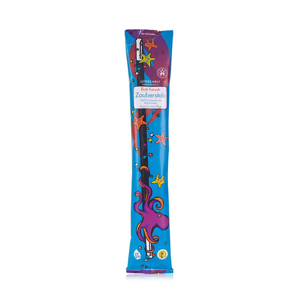 - Lüttes Welt Zauberstab, Motiv: Beste Freunde, Malt blaue und rote Farbspuren ins Badewasser, pflegt die empfindliche Kinderhaut zart. Enthält natürliches Meersalz, Carbonate, Weinsäure, Jojobaöl, Färberdistelöl, Kieselsäure, milde Tenside aus natürlichen Fettsäuren und natürliche ätherische Öle, vegan, Duft: Elfenduft