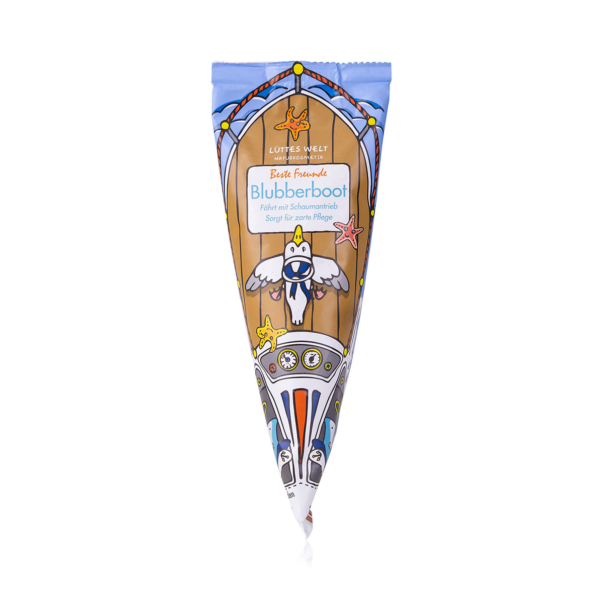 - Lüttes Welt Blubberboot, Motiv: Beste Freunde, Das Blubberboot fährt ohne eigenes Zutun dank Kohlensäure-Antrieb, der aus der Reaktion von Natriumbikarbonat und Weinsäure zu Kohlensäure entsteht. Mit Macadamianussöl, Kakaobutter und Distelöl, vegan, Duft: Elfenduft,