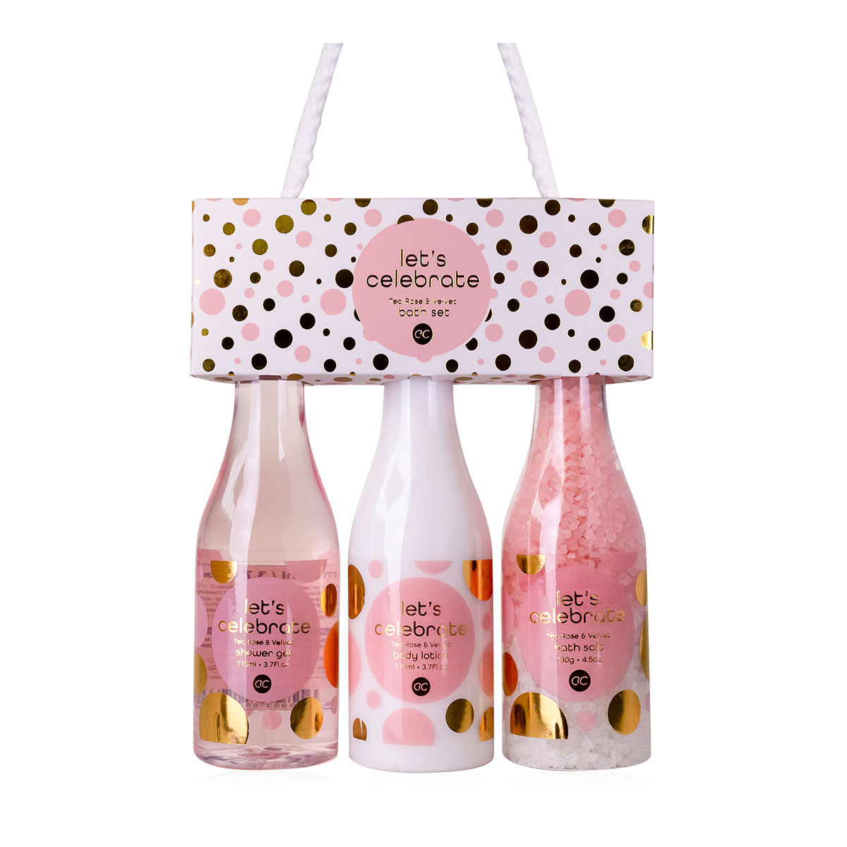 • 1x Badeset LET'S CELEBRATE in Geschenkverpackung, inkl. 110ml Duschgel, 110ml Bodylotion, 130g Badesalz, Duft: Tea Rose & Velvet